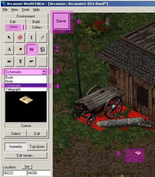 Как Вы уже поняли — открываем в редакторе необходимую карту. У меня это: Arcanum1-024-fixed, локация Туманные Холмы (у Вас — та, что вы выбрали, любая т. е.). Нахожу точку с нужными мне координатами и размещаю на карте любой схематик: Рис.1. (я очень подробно описал как это делать здесь. Почитайте еще разок, если подзабыли). В принципе, очередность действий, — по цифрам, на то они там и проставлены.