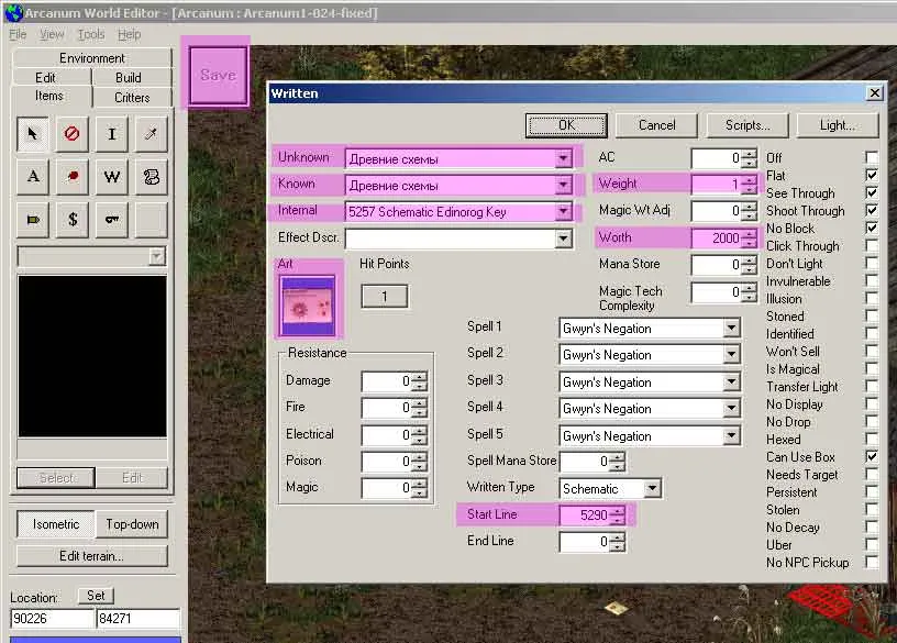 Возвращаемся к коду. Желтые метки. Вся цифирь, отмеченная желтым — отвечает за графику — как предмет выглядит в четырех основных видах — на «земле», в контейнере (или инвентаре), в «руках» и на схематике. Все подробности — по ссылке, а мне более ничего в hex править для моего ключика не надо... Кроме. Самого важного.