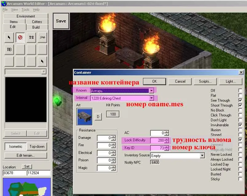 Его я не знаю, где в коде его прописать. Вот незадача. Без номера ключ ничего не откроет, ведь он забивается в параметры контейнера — рис.8. Мой номер ключа — {73}{Ключ Единорога}, я его и «прошил» в контейнер-алтарь.
