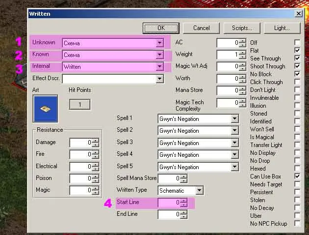 1. и 2. В данном случае — одно и то же. Не известное и известное название схемы. Прописываем в файле /modules/Arcanum/mes/gamedesc.mes.