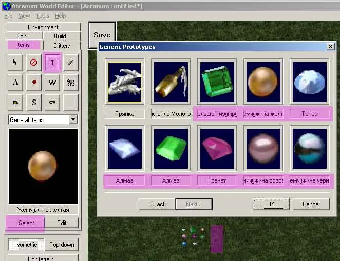 Открываем игровой редактор — рис. 2 — жмем кнопки — item — I — Select. Находим новые предметы. У меня все ОК — рис. 2, все камни на месте.