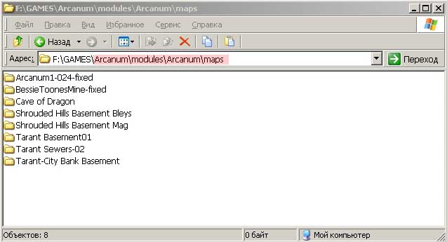 Дополнение: Теперь попробуем всё еще раз поподробней. Сразу — все .dat файлы должны быть распакованы и лежать где-то (НЕ В ИГРЕ!) в том виде, как вы их распаковали. У Вас будет четыре папки-каталога: Arcanum1.dat, Arcanum2.dat, Arcanum3.dat, Arcanum.dat (типа скрин Рис.2). Из каталога Arcanum.dat копируем и перемещаем в каталог с игрой необходимые вам папки с картами (карты — в папке maps). Карта (карты), с которой Вы будете работать должны находиться в папке Arcanum/modules/Arcanum/maps (первый Arcanum — каталог Вашей игры, здесь и везде). Типа — таким образом: Рис.1. (для увеличения изображения — щёлкни по скриншоту). Надеюсь, что пока всё понятно (здесь написано слишком подробно, но эти «мелочи» — основы, без них ничего не получится. То, что кажется очевидным и банальным (на первый взгляд) может представлять значительную проблему).