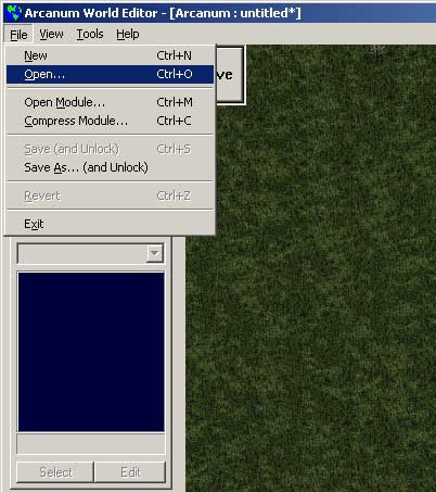 Теперь открываем редактор WorldEd и находим нужную Вам карту (допустим — основную, Arcanum1-024-fixed). Я уже писал, как её открывать в предыдущем мануале. Повторюсь. Если в редакторе WorldEd Вы увидели (ну и открыли) карту arcanum1-024-fixed — Ура! и можно продолжать. Но. Частая ошибка. — Открыв редактор и выбрав модуль (Arcanum) — вы не видите карты. Зайдите в головное меню и выберете Open (а не open modules) — рис4—5. Пустячок. Но бывает. И часто. Выбрав нужную карту — открываем...