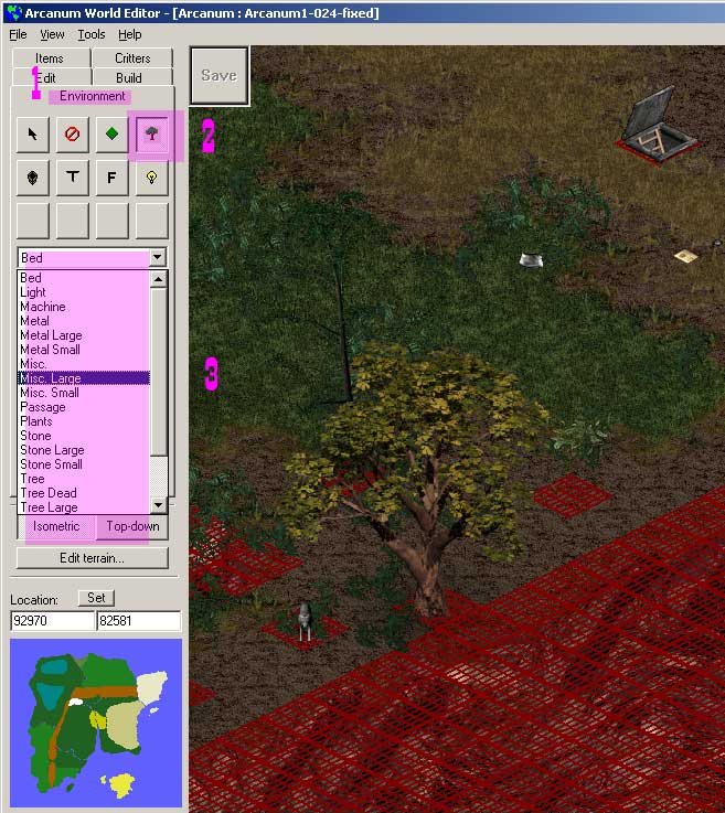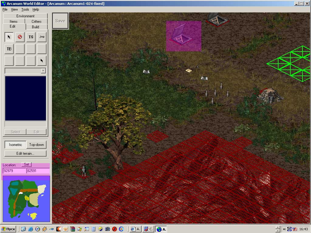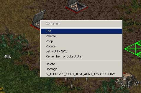 Наконец добираемся до сути вопроса. Рассмотрим его на примере, чтоб было понятней. Открываем редактор и устанавливаем координаты 92960,82592 — место катастрофы — Рис.7. Фиолетовым — отмечено окошко с координатами и будущий портал — люк (а может он быть могилой, сундуком, паровозом, дверью и т.п. — да, конечно). Расписывать — как поставить предмет на карту — здесь не будем — см.Рис.8, всё в три щелчка. Картинки там во весь экран — не забудьте развернуть... Итак, этот люк — портал, при нажатии на него в игре Вы перенесетесь в указанную Вами точку. Как его сделать. Наводим курсор на люк (см. Рис.9), жмём правую кнопку. В открывшемся меню нажимаем ’edit’.