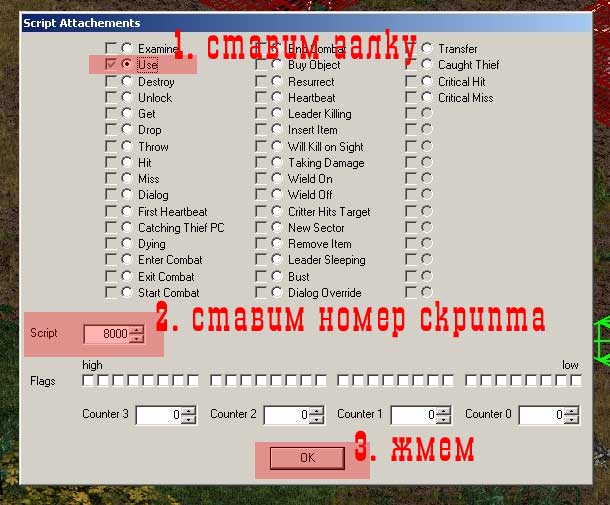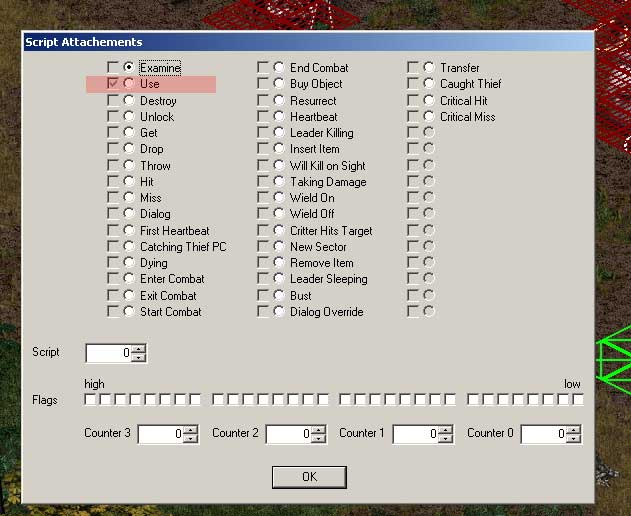 Попадаем в другое меню — Рис.10. Там много всего. Важное сейчас отмечены разными цветами — расстановка флажков (песня отдельная и сами разберетесь) — пока просто скопируйте — как у меня. Внешний вид (в нашем случае — люк). Если Вы научились ставить на поверхность предметы, то всё ОК, нужный Вам уже стоит, но в данном окошке можно изменить его рисунок. (Сами, опять же поймете — как, не сложно). И самое главное — кнопка ’skripts’. Если флаги Вы расставили — жмите её. Попадаем в очередное меню — рис.11. Как понятно из картинки, в игре присутствует бешеное количество скриптов самого различного назначения. При телепортации задействован скрипт, реализуемый командой ’Use’, кнопку которой мы и жмём — рис.12.