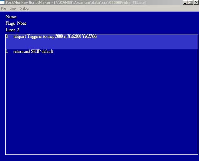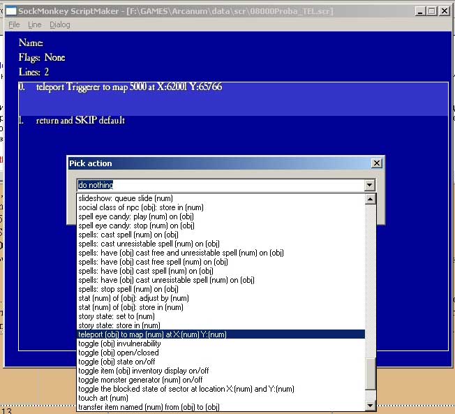 Для того, чтоб спокойно его открыть, из распакованного архива копируем и вставляем в игру скрипт образец (потом его лучше удалить). Теперь откроем его редактором скрипта ScrMaker (он в корне игры. Выберете в меню ’fale’ пункт ’open’). Смотрим Рис.13. Очевидно, что данный скрипт посылает нас на карту 5000 в координаты X ... и Y... Но это готовый скрипт, нам нужен свой. Сохраняем прототип как... 8000_proba_tel.scr и начинаем его редактировать. В меню ’line’ выбираем первую строчку — ’action’. В выпавшем меню (рис.14) находим строчку ’ teleport...’ — ОК, ’Trigger’ — ОК, ’Number’ — ’5000’ (вводим номер карты) — ОК, ’number’ — ’6750’ (координаты по Х) — ОК, ’number’ — ’4320’ (вводим координаты по Y) — ОК. Появилась Ваша строчка скрипта. Теперь выберите старую «лишнюю» (со старыми координатами) и через то же меню ’line’ удалите ее ’delete’. Получился двухстрочный (не вздумайте удалить вторую строку ’Return &...’) рабочий скрипт телепорта. Сохраняйтесь. Всё. Аналогично делается любой другой скрипт телепортации. Надеюсь, что что-то прояснилось. Осталось проверить портал. Запускайте игру — и удачи. (Не забывайте чистить папку ’maps’ после каждого запуска игры, как я писал выше).
